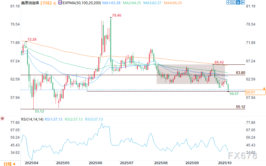 以哈停火后,中东风险溢价下降   以色列与哈马斯达成停火协议后,地缘政治风险溢价逐步消除,原油价格随之回落。在美国支持的协议框架下,以色列将从加沙部分撤军,以换取人质和囚犯的释放。紧张局势缓解后,红海和苏伊士运河航道面临的威胁降低——这两条航道在近几个月一直是支撑原油价格的重要因素。   北欧联合银行(SEB)的比亚尼·希尔卓普(Bjarne Schieldrop)表示:“停火协议的生效,让市场对全球原油运输安全的担忧有所缓解。”这一变化正在逐步消除2023年末以来油价中包含的战争相关风险溢价。   尽管停火新闻受关注,欧佩克产量仍为市场焦点   尽管加沙停火协议占据新闻头条,但交易员正将注意力重新转向供应前景。欧佩克+(OPEC+,石油输出国组织及其盟友)同意11月的产量增幅低于预期,这在一定程度上缓解了市场对供应过剩的担忧。BMI(研究机构)分析师指出,近期的供应增长“并未导致油价大幅下跌”,这为布伦特原油(Brent,国际基准原油)单周小幅上涨提供了支撑。   不过,WTI原油单周仍下跌0.5%,而布伦特原油单周上涨1%。美国政治风险仍在市场关注范围内,因对政府长期停摆的担忧可能会影响经济活动及能源需求。   市场展望:63美元阻力位下方看空情绪升温